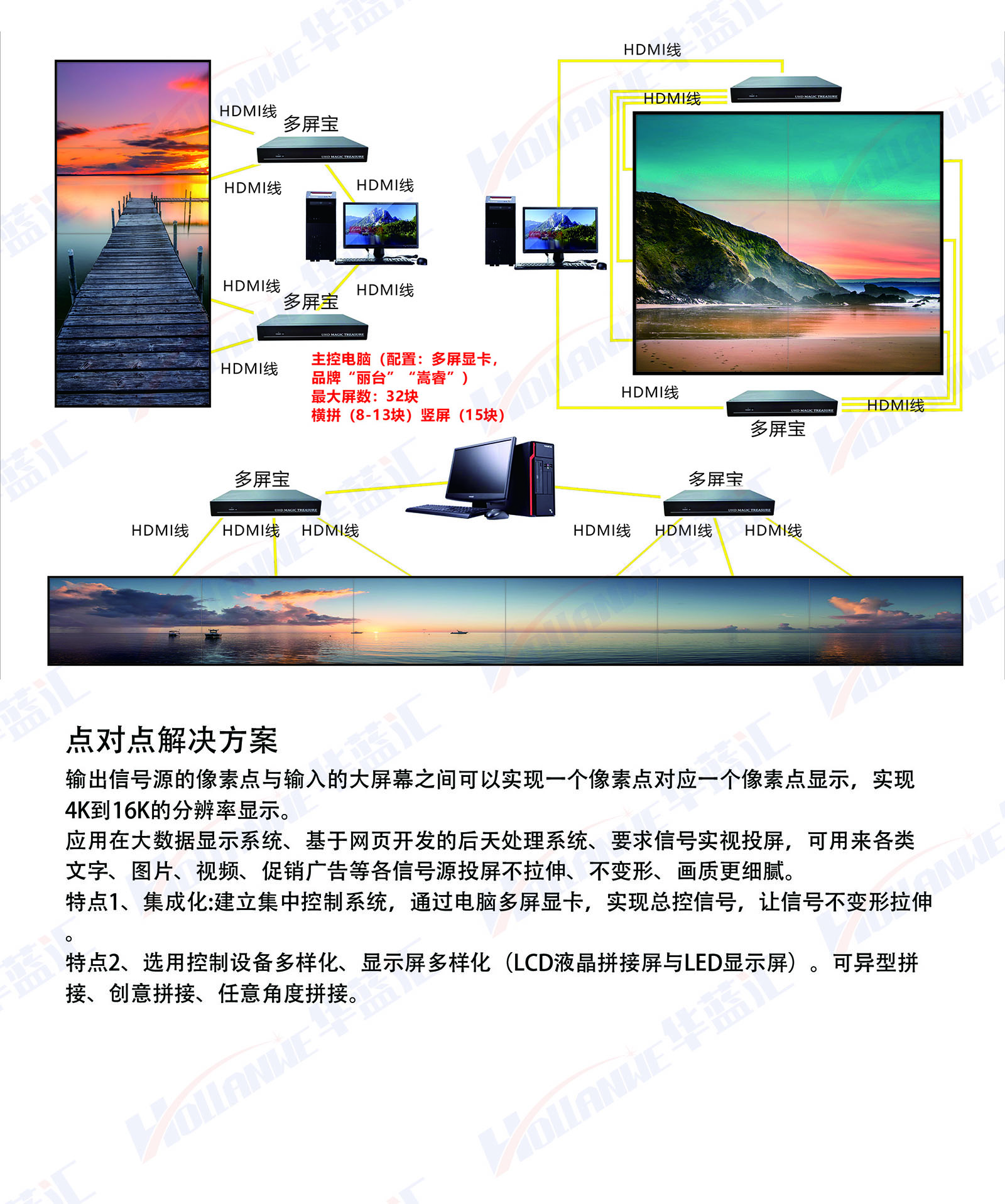 特點(diǎn)1、集成化:建立集中控制系統(tǒng),通過(guò)電腦多屏顯卡,實(shí)現(xiàn)總控信號(hào),讓信號(hào)不變形拉伸。